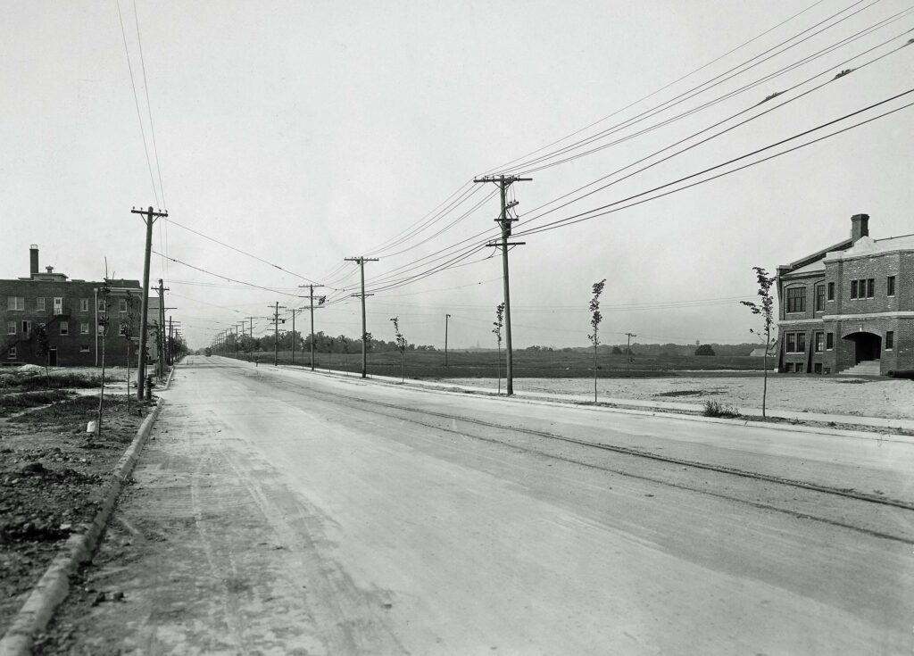 For much of the 19th century, the street, which is on a section line, wasn’t much more than a path for use by farmers and land speculators.  Oakland Avenue, a street in Milwaukee, was extended north all the way to Day Avenue in Whitefish Bay near the end of the century.  By 1898, the Milwaukee Electric Railway and Light Co. (TMER&L) extended street car service from Milwaukee north along Oakland Avenue.  Passengers from Milwaukee rode the street car to visit the Pabst Whitefish Bay Resort, Mineral Springs Park in Shorewood and summer cottages along the lake.