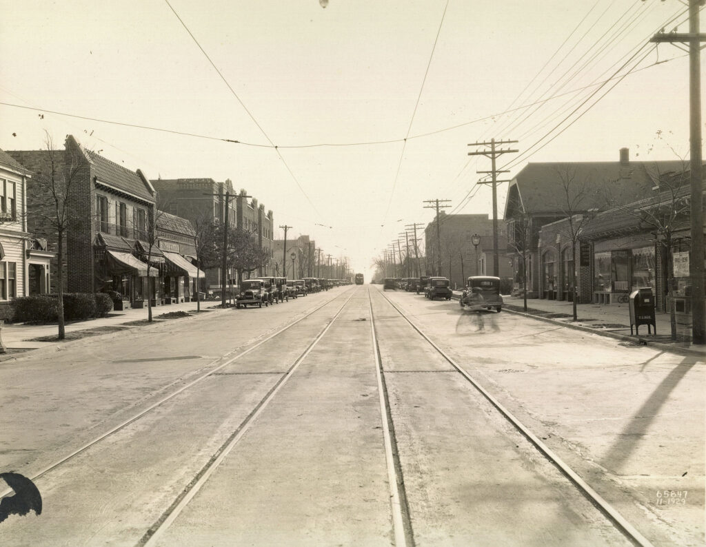 For much of the 19th century, the street, which is on a section line, wasn’t much more than a path for use by farmers and land speculators.  Oakland Avenue, a street in Milwaukee, was extended north all the way to Day Avenue in Whitefish Bay near the end of the century.  By 1898, the Milwaukee Electric Railway and Light Co. (TMER&L) extended street car service from Milwaukee north along Oakland Avenue.  Passengers from Milwaukee rode the street car to visit the Pabst Whitefish Bay Resort, Mineral Springs Park in Shorewood and summer cottages along the lake.